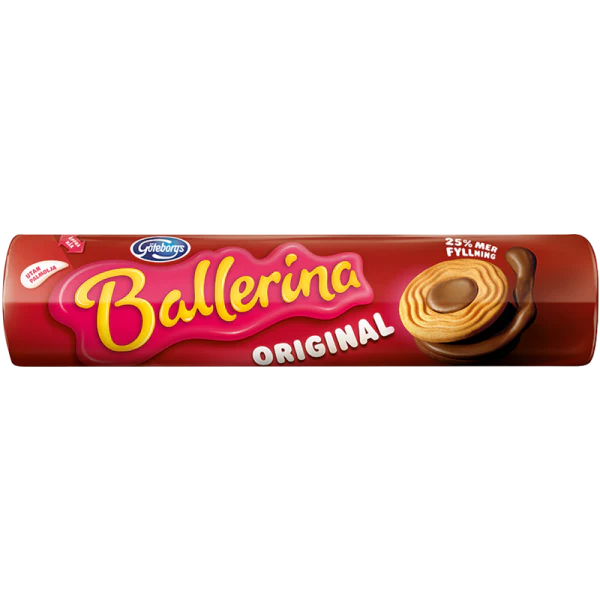 Ballerina is Sweden's most beloved cookie and Göteborgs Kex's most popular brand. The round original has been around since 1963. Irresistible cookies with crispy biscuits and smooth nougat cream. Perfect cookies for a coffee break, party or outing! Ballerina products are baked without palm oil.